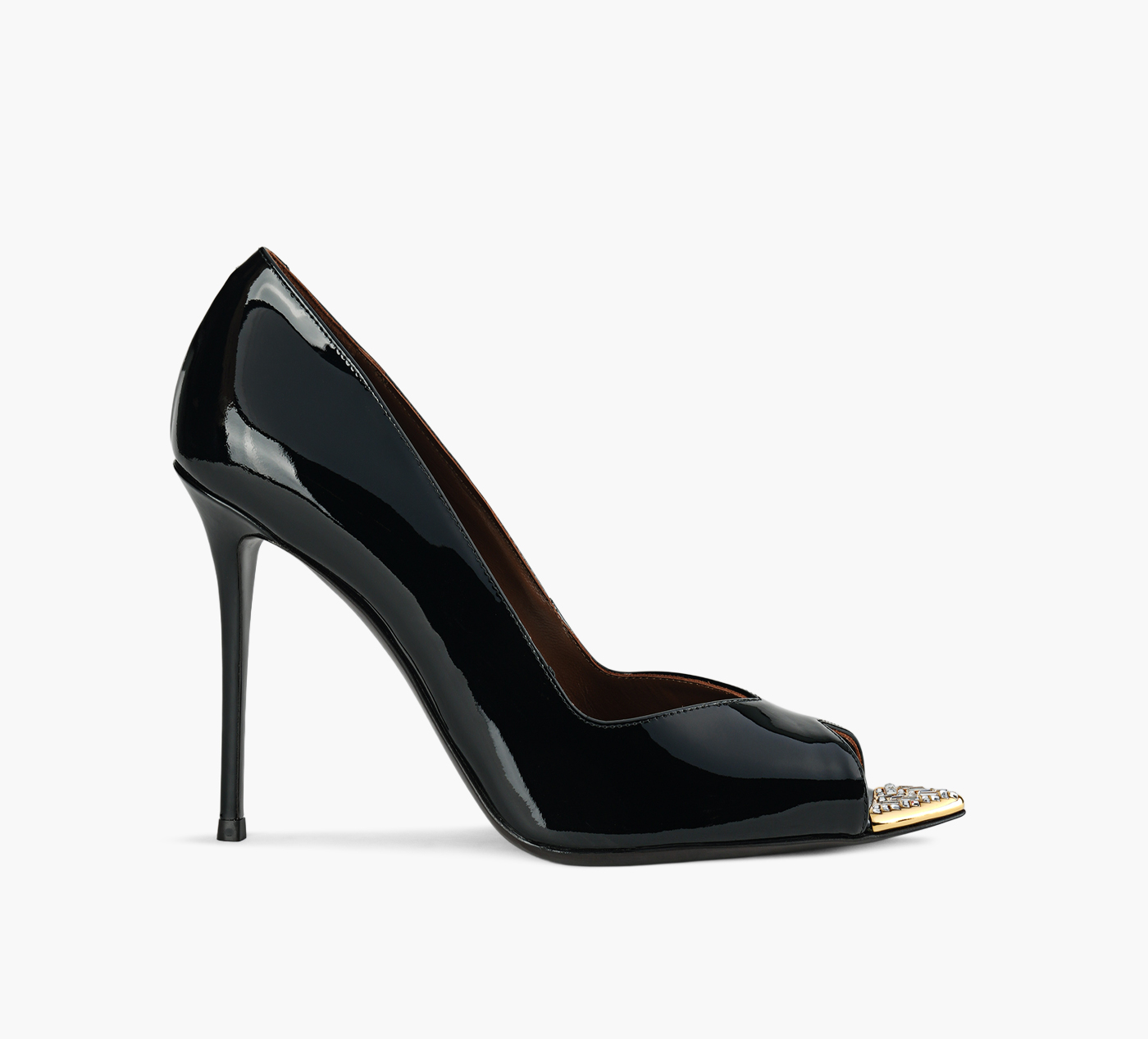 Giuseppe Zanotti's Intriigo Crystal Open-Toe is a bold expression of elegance. Crafted in glossy patent leather, it features a pointed open toe, metal toe detail, and a dazzling mix of square and baguette rhinestones. Set on a 105mm stiletto heel, it’s a sculptural silhouette made for standout moments.