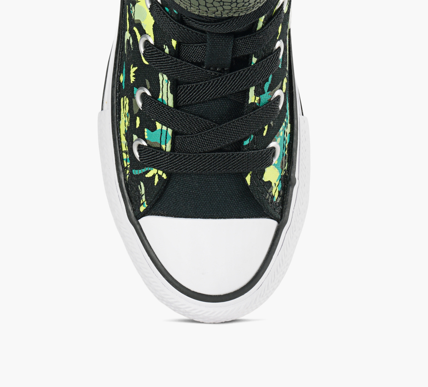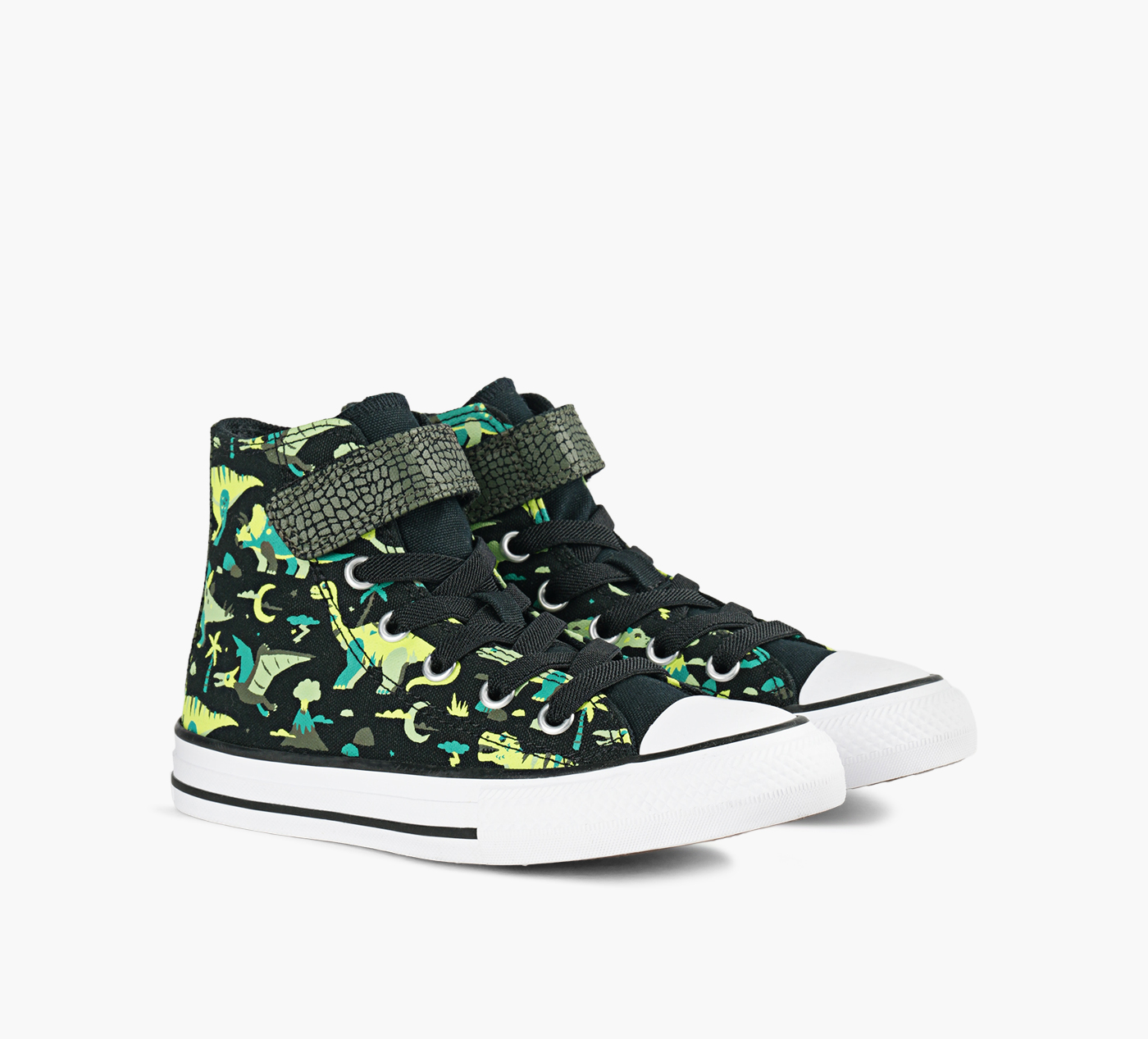 Let your little one's imagination roar with the Converse Chuck Taylor All Star 2V Dinocons Hi-Top. Featuring a fun dinosaur print and the iconic Converse silhouette, these sneakers combine classic style with kid-friendly comfort. An easy hook-and-loop strap makes getting ready a breeze, while the durable rubber sole keeps up with every adventure.