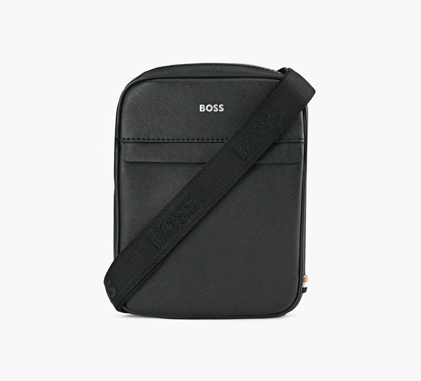 The Zair crossbody bag by BOSS combines elegance and function. Made from textured faux leather, it features a zippered main compartment, a handy front pocket, and an adjustable strap for comfortable wear. Its compact size makes it perfect for carrying essentials in style, whether daily or on the go.