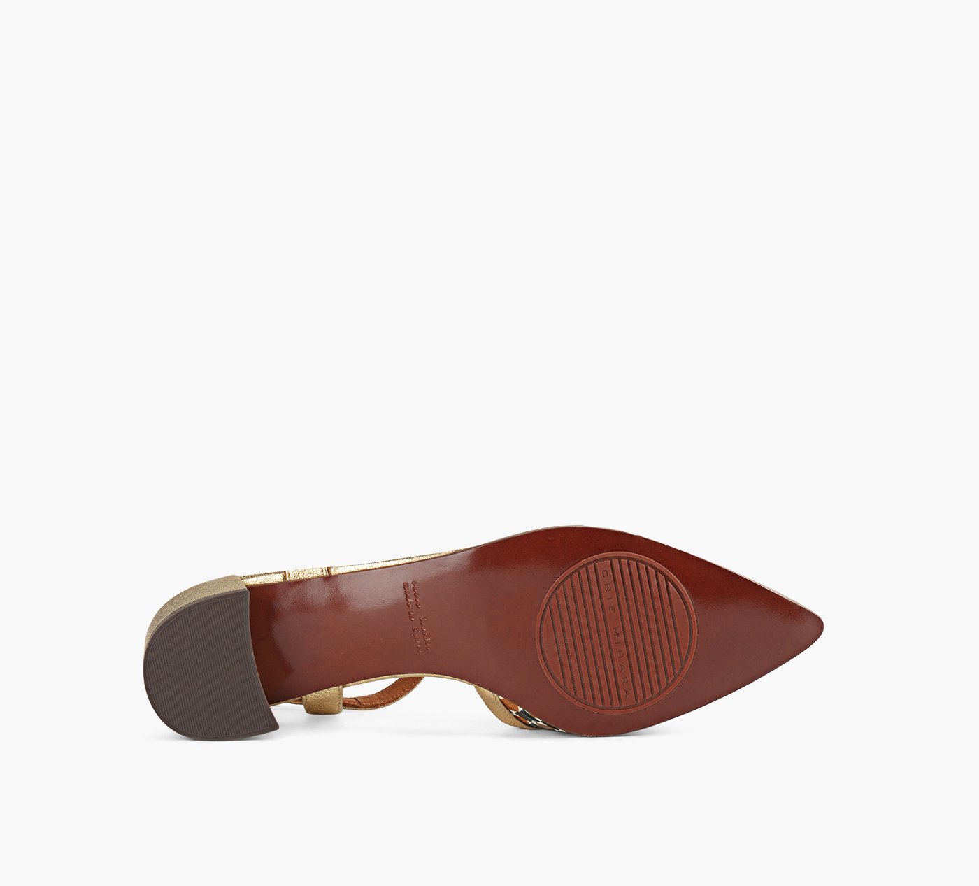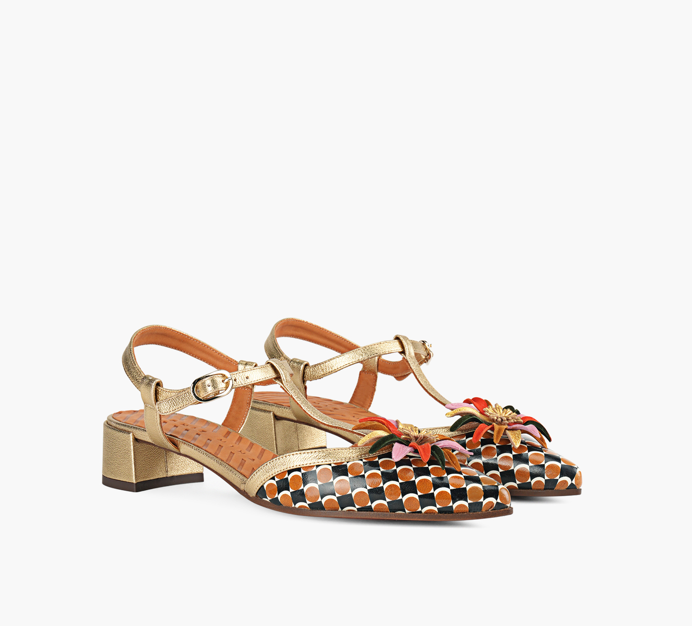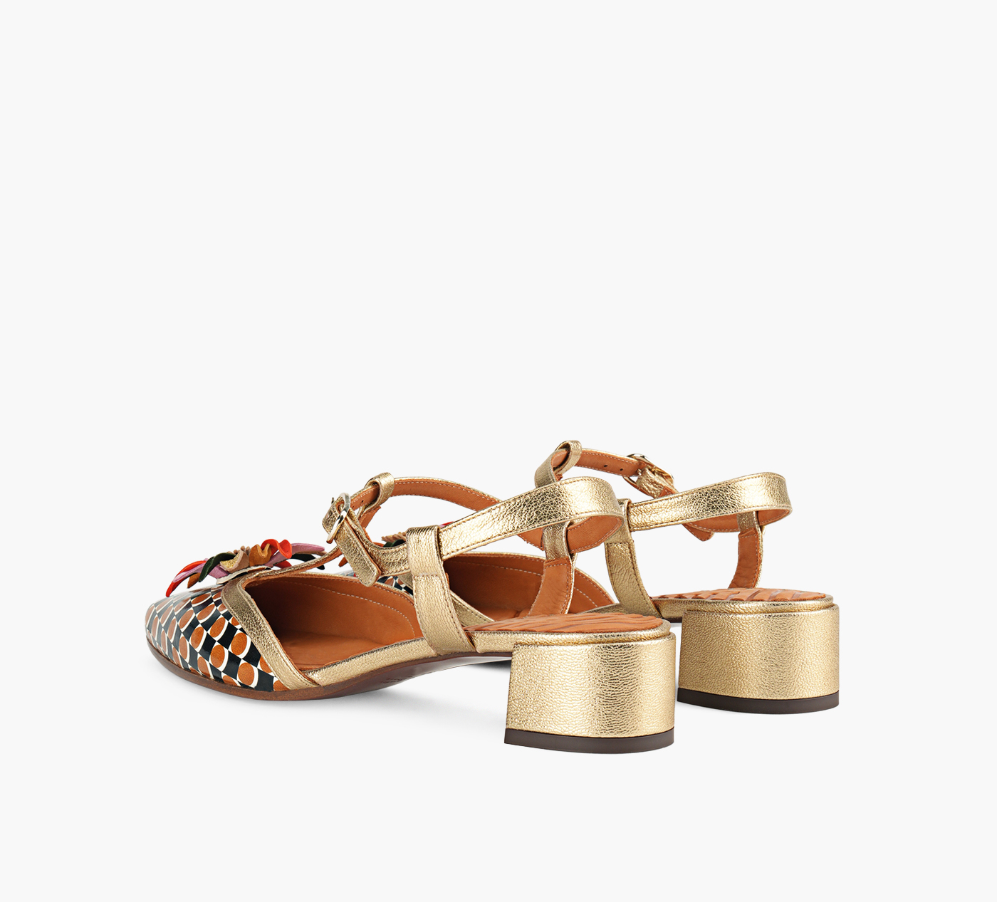 The Chie Mihara Heleni pump blends romantic detailing with sculptural balance. Crafted in smooth calf leather, this pointed‑toe style features a T‑bar strap accented with floral embellishment and secured by a buckle closure. A stable block heel adds comfort and poise, while leather lining and sole ensure a refined finish for elevated day‑to‑evening wear.