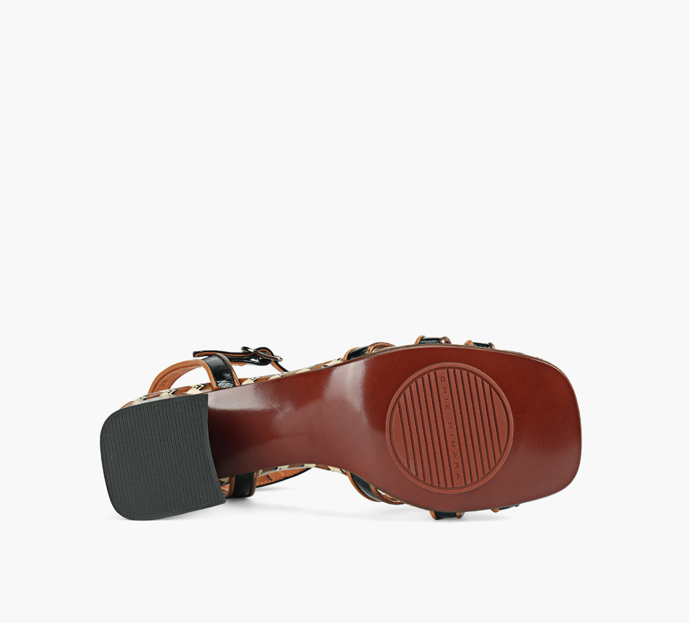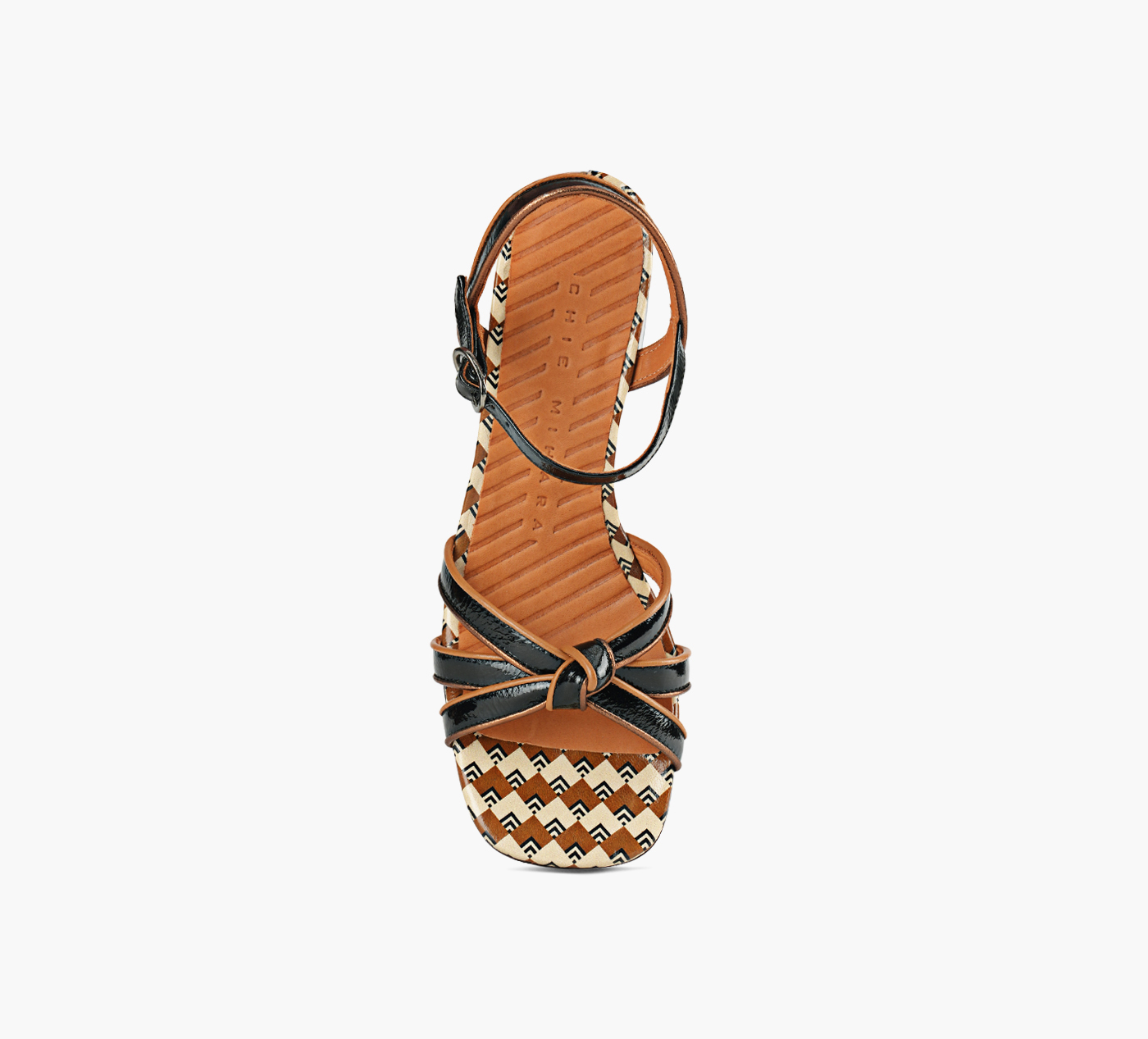 The Chie Mihara Leilah sandal combines artisanal texture with everyday elegance. Crafted from ultra‑soft leather, it features metallic and patent‑effect finishes alongside a subtle geometric print. A comfortable mid‑height, self‑covered heel and soft leather lining ensure all‑day wear, while the adjustable buckle delivers a secure, flattering fit.