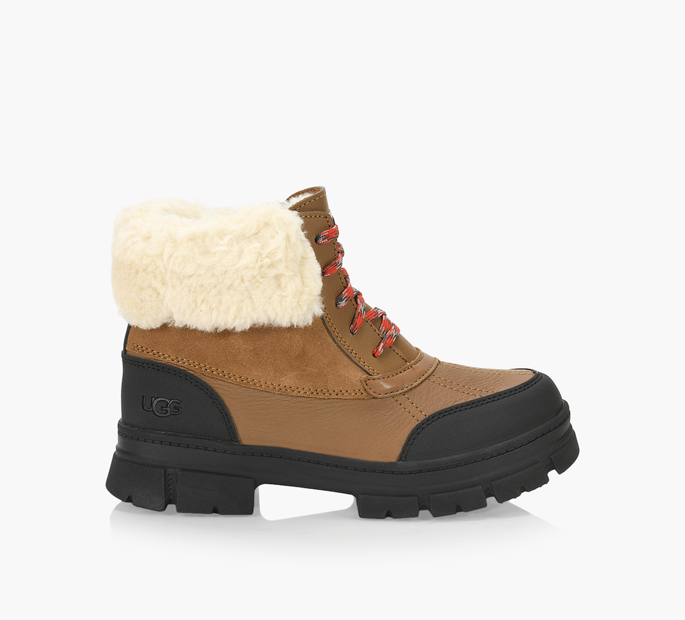 Combining the exaggerated lug sole of UGG's Ashton with the unmistakable silhouette of the iconic Adirondack, this new weather boot gives you the best of both. Crafted from waterproof materials and sealed seams to help protect against light rain, it offers signature softness with our UGGplush™ wool blend and microfiber lining. Pair with the matching women's boot for cute mini-me photo ops.