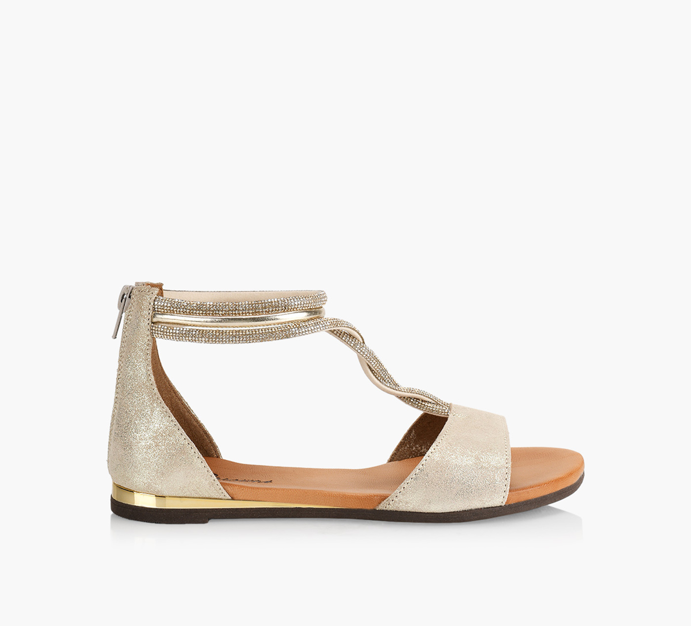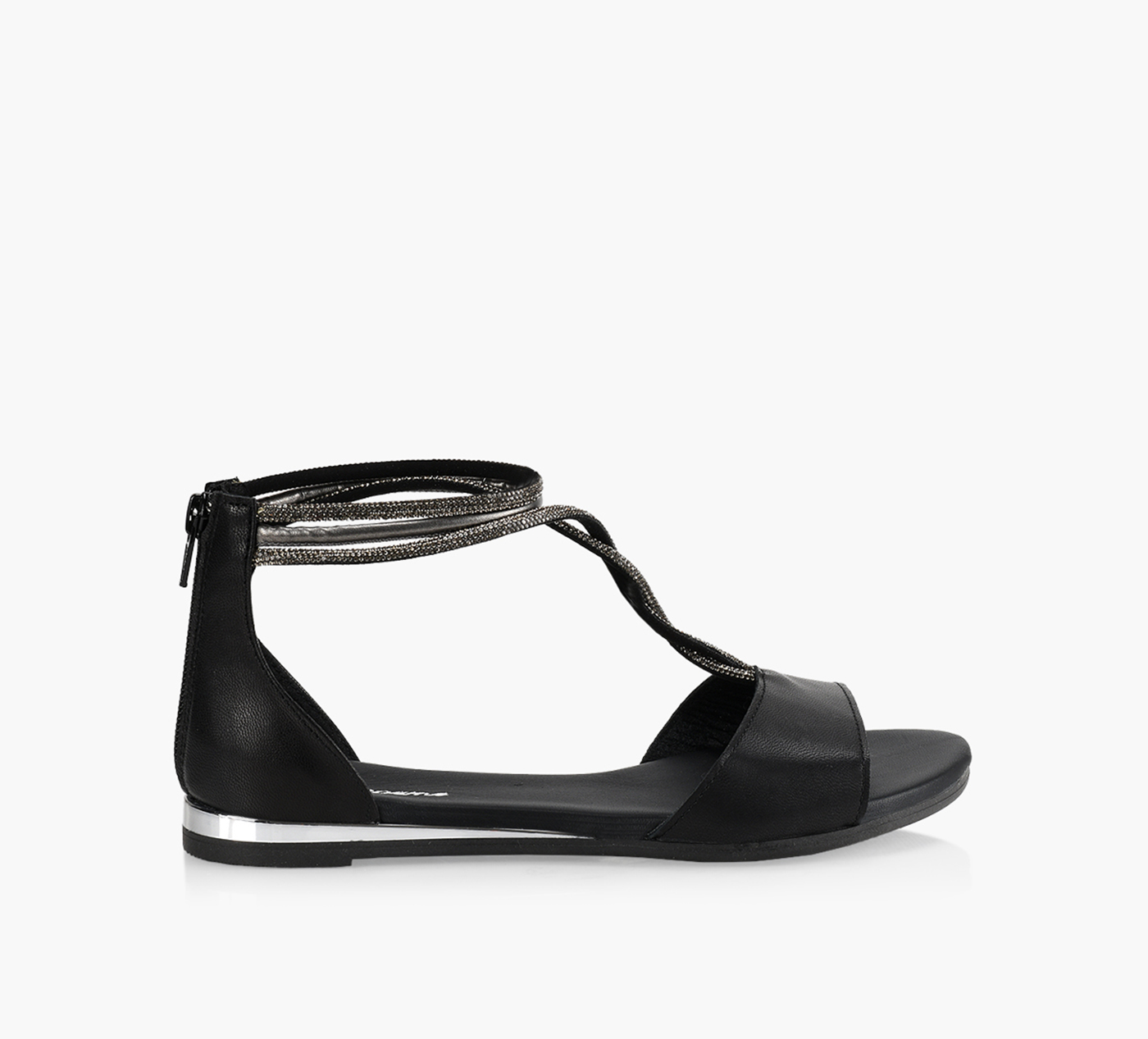 These chic flats come equipped with the classic shape of toe-strap and matching covered heel, made all the more elegant by a bedazzled ankle loop and criss-crossed, linked mid-straps.
