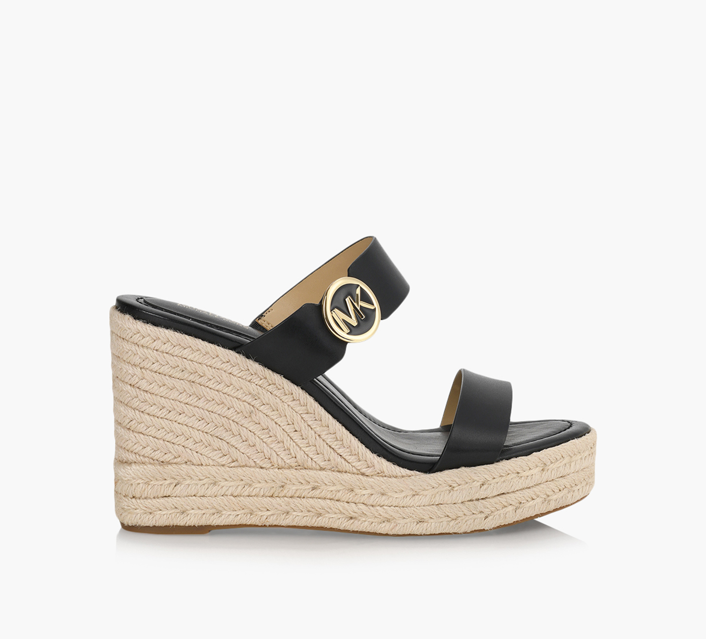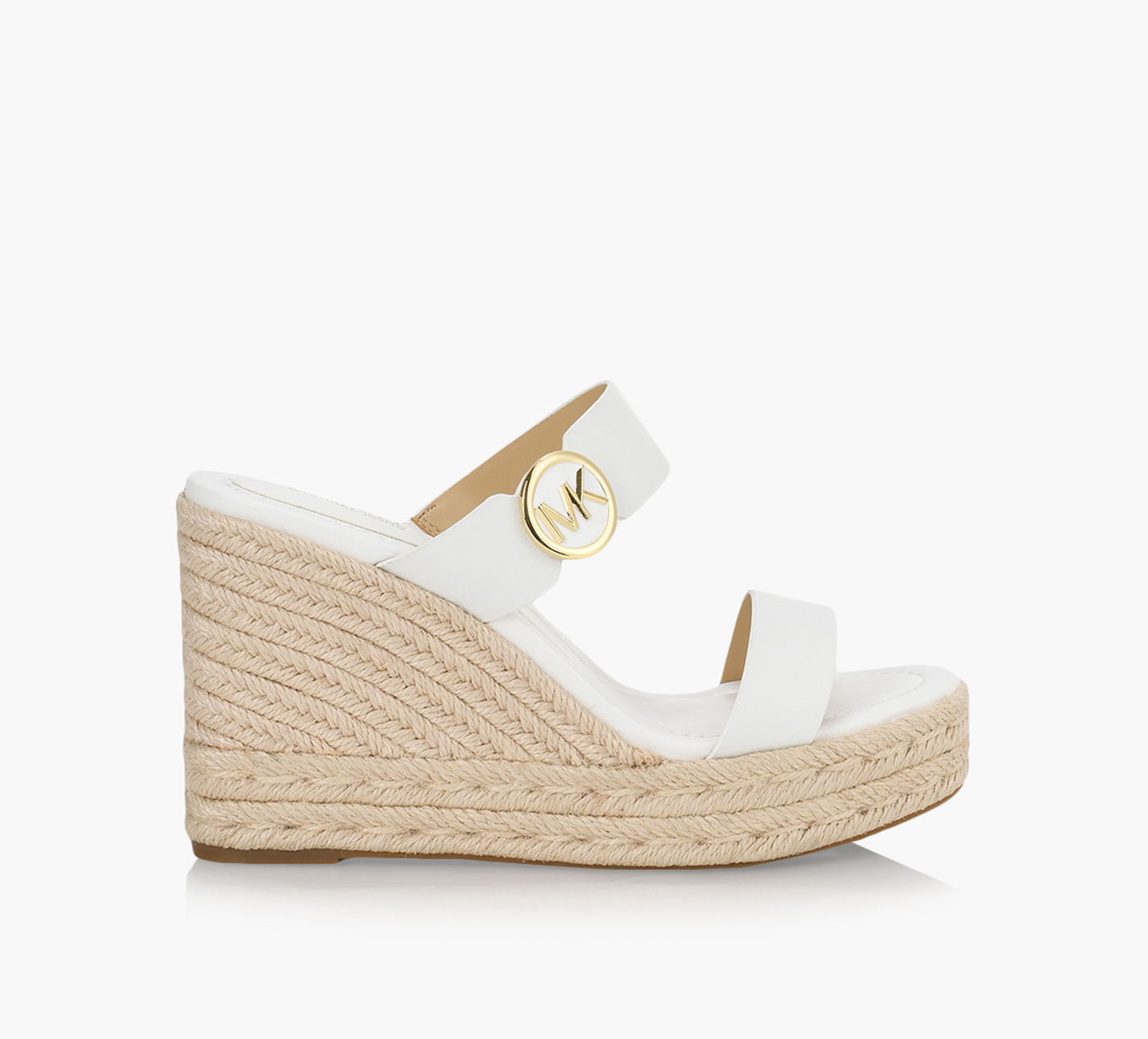 Wicker-trimmed wedges by MK, Lucinda sticks to the trend of double-strapped wedge sandals, with the added finish of an MK charm on the top strap.
