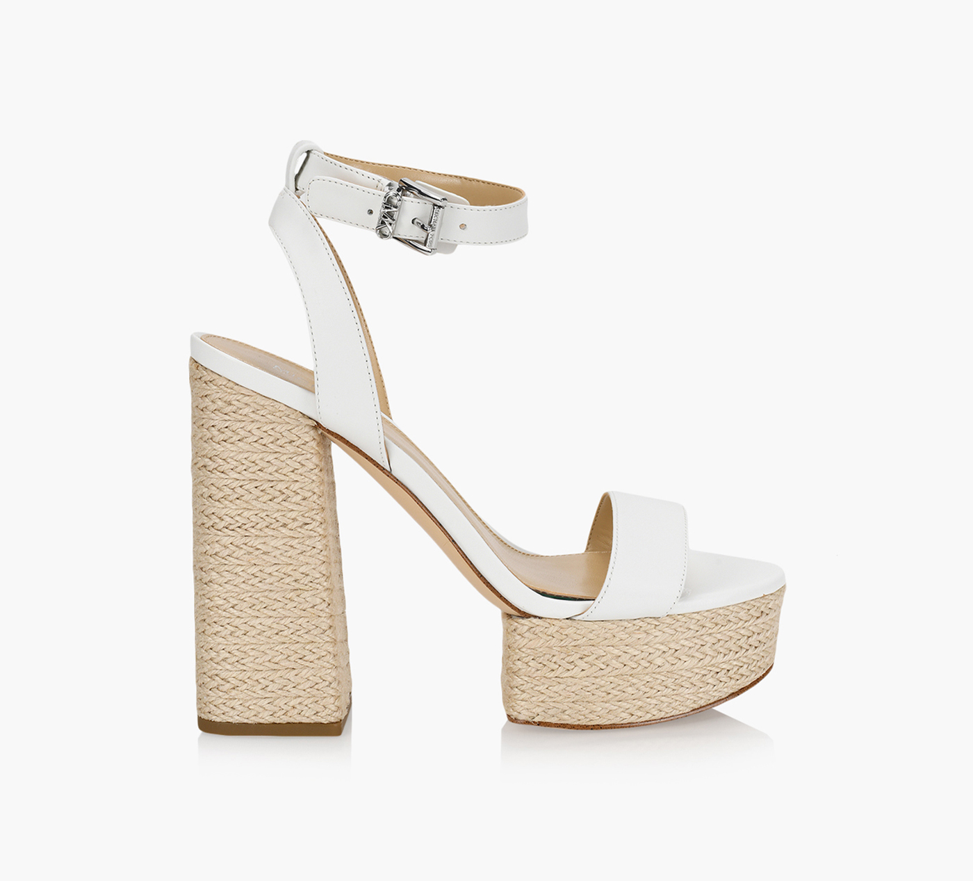 Ashton by MK offers a look that is entirely modern yet sensitive to the styles of a more vintage bent. With its tall block heel and platform to match, the deep curve of its footbed does much to highlight its minimalistic straps at the heel, ankle and toe for an unabashedly chic look. Finished with MK hardware at the buckle and a summery woven wicker trim on the platform.
