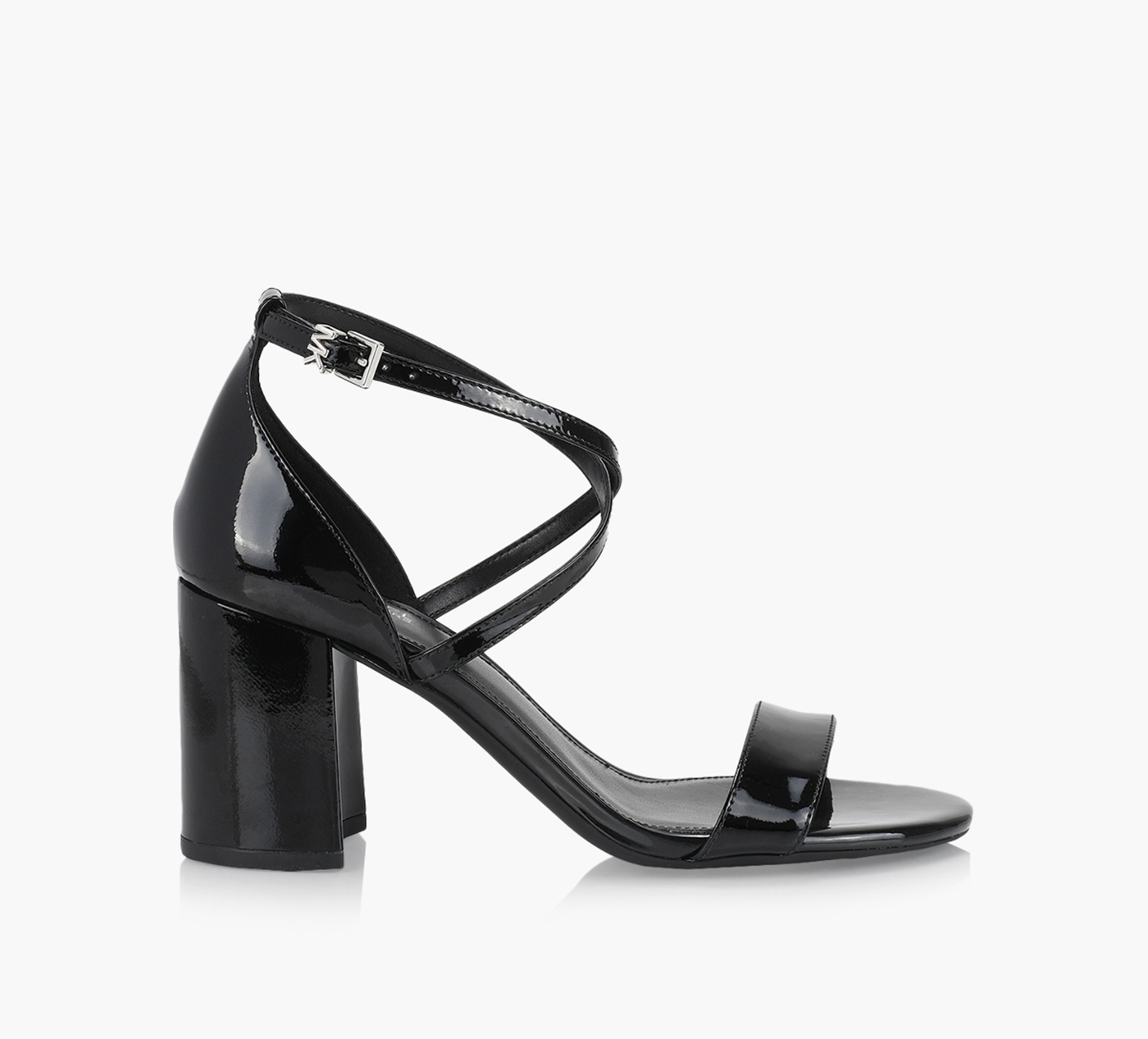 These strappy heels by Michael Kors feature a covered heel with a thick retro-inspired heel to match, and are closed with trendy criss-crossed straps.
