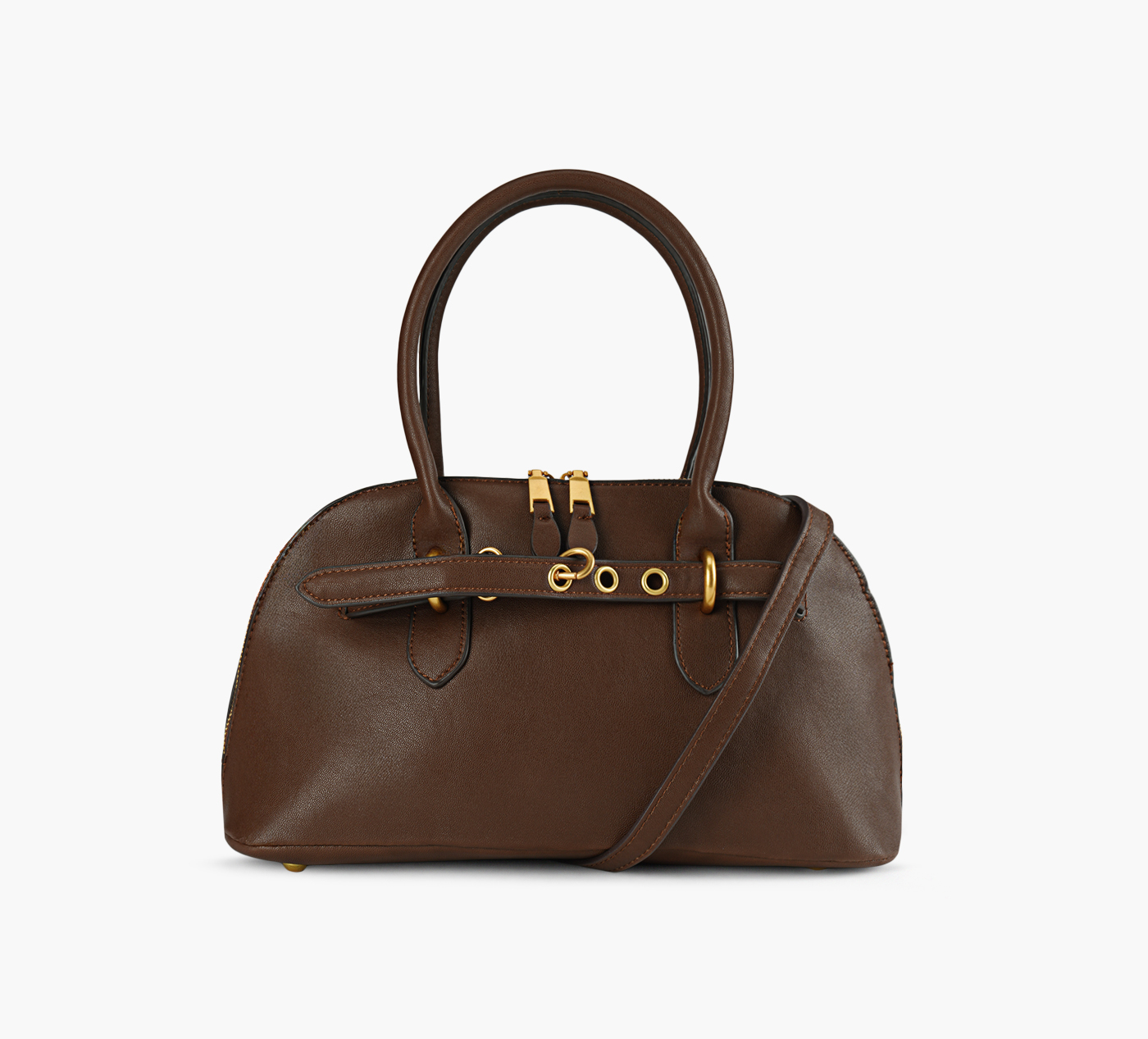 WISHBONE puts its own spin on a classic bowling silhouette with the Kaela bag. Crafted from soft faux leather, this style is cut to a roomy half-moon profile, primed and ready to house your daily essentials with ease. Two sturdy top straps adorn the style for hands-free carrying, while the gold-toned, gleaming hardware adds a healthy dose of shine to any ensemble.