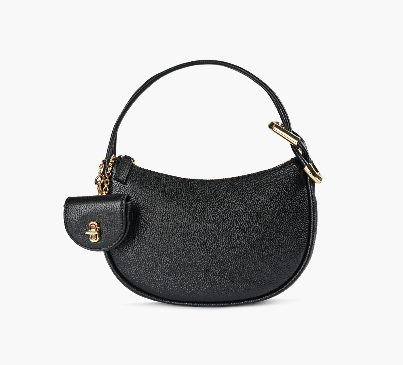 Meet the Marc Jacobs Dual Hobo Bag, a slouchy crescent-shaped shoulder bag with Dual-inspired detailing and a sleekly minimalistic silhouette. Crafted from pebble leather, it features the label's signature handle-adorning Dual hardware and a removable earbud case bag charm. With a top zip closure, internal zip pocket, and an external removable turnlock pouch, this bag combines timeless sophistication with practical functionality.