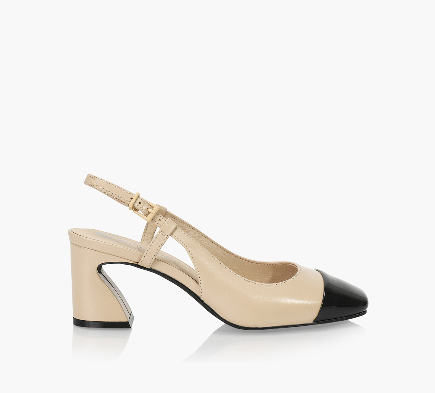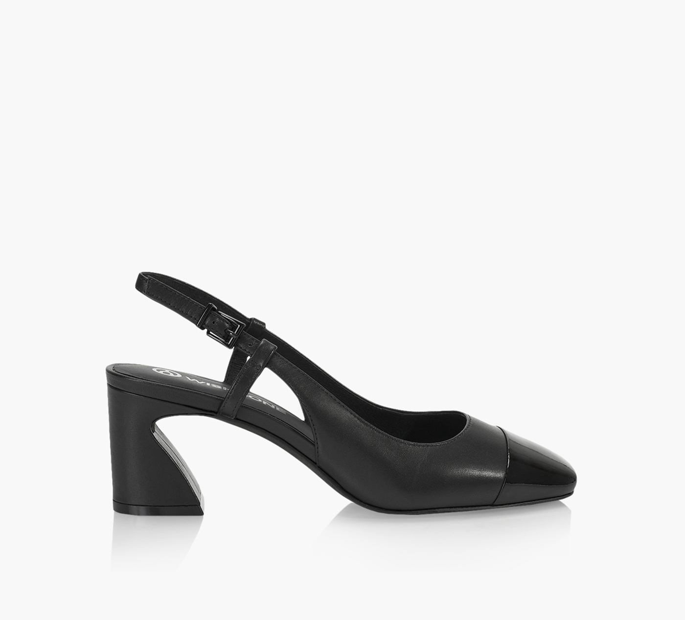 Sling-strap heels with hints of the avant-garde: Dora explores some new territory while keeping things surprisingly simple. A contrasting toe panel makes a point, while WISHBONE’s iconic convex heel further complements the arch. Dora seeks to capture your attention with minimal effort.
