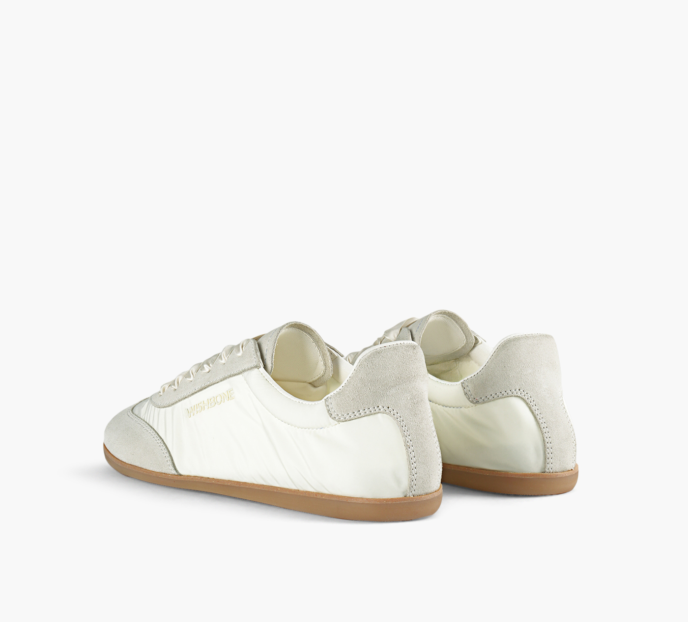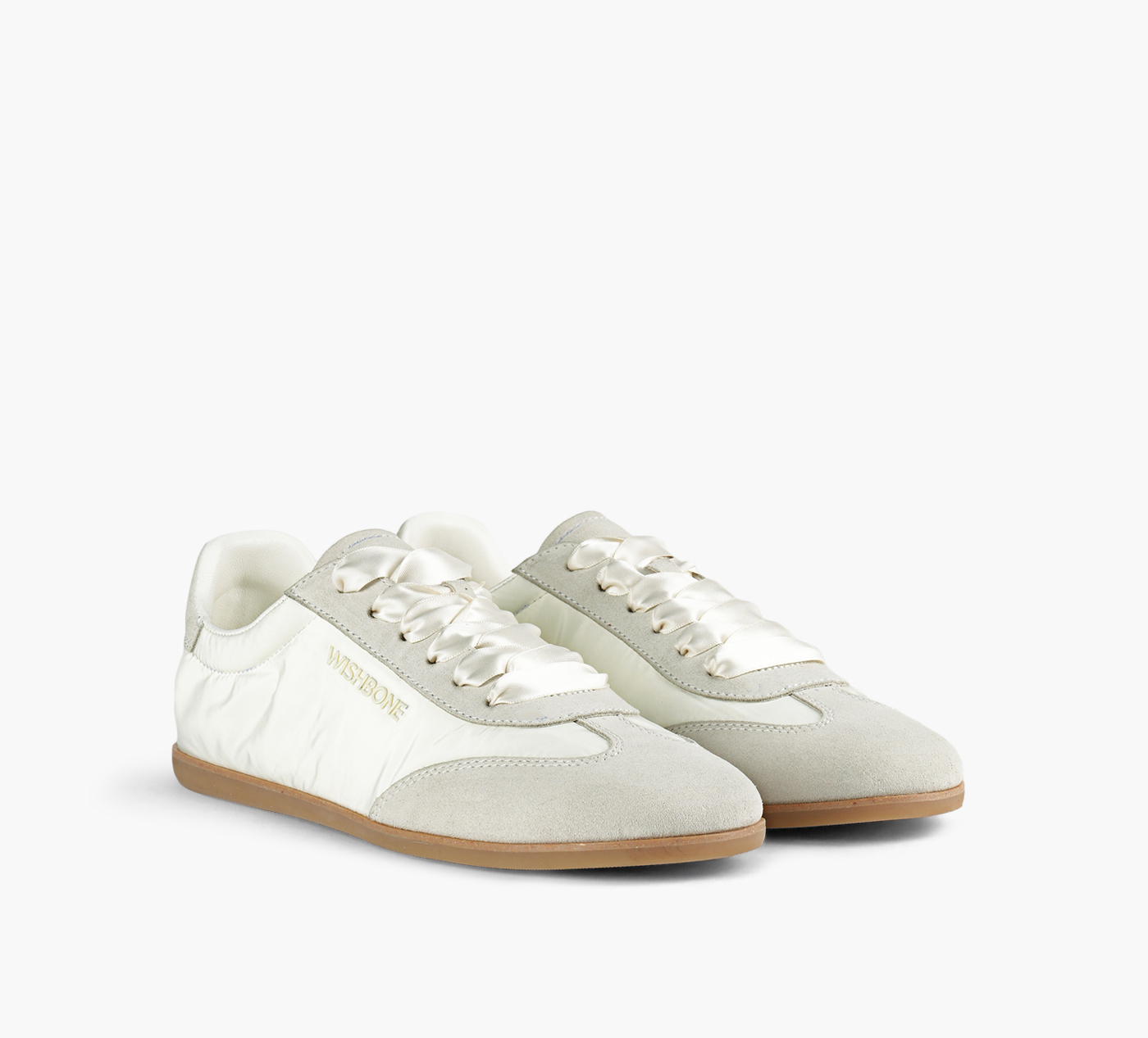 WISHBONE's Darla sneakers are every romantic's answer to a need for sneakers. Adopting a slim-fitting, low profile, this pair's minimalist demeanour is grounded on a cushioned flat sole paired with a panelled construction of suede and nylon. Classic lacing gets swapped out for gleaming ribbons, all before being finished with the label's logo lettered at the sides.