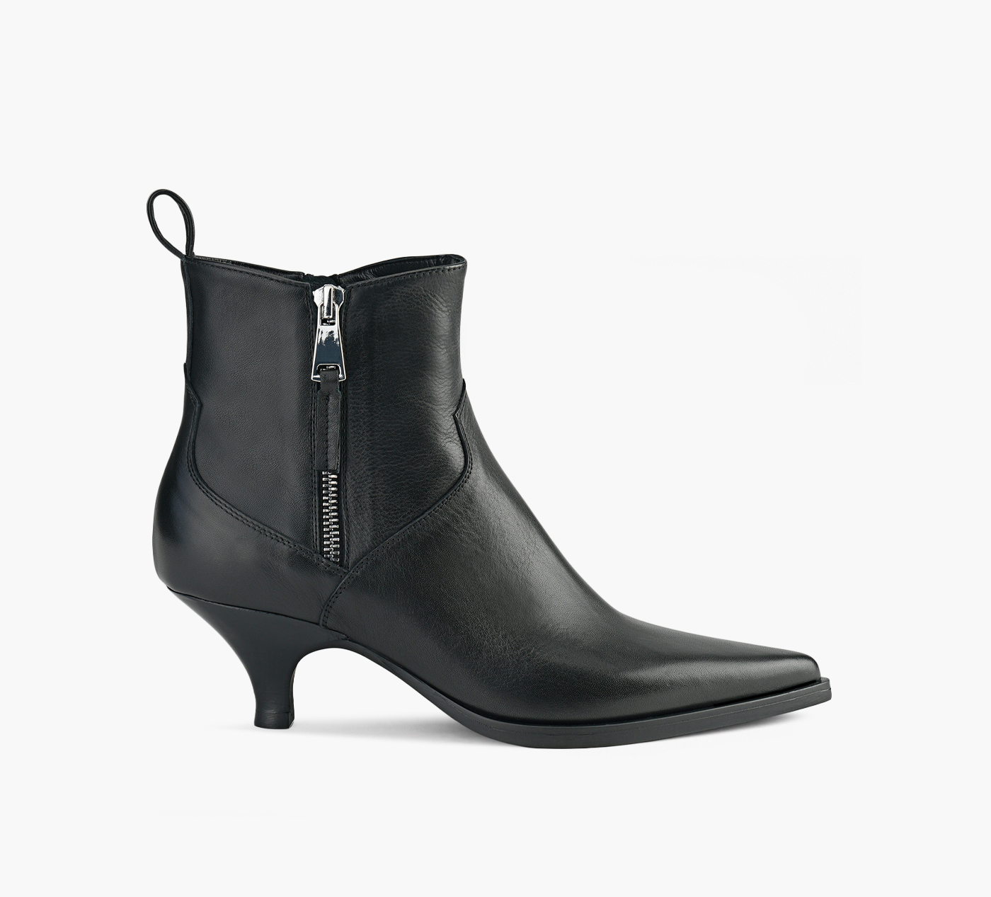 Elena Iachi a un faible assumé pour les designs inspirés du Far West — du moins, c’est ce que laisse penser sa collection. Dernière arrivée dans la gamme : la bottine Polaris. Confectionnée en cuir, cette paire à la silhouette montante se distingue par son bout pointu allongé et son talon kitten sculpté. Des fermetures éclair brillantes ornent les côtés pour une touche lumineuse, tandis que des languettes pratiques à l’arrière facilitent l’enfilage, même en déplacement.