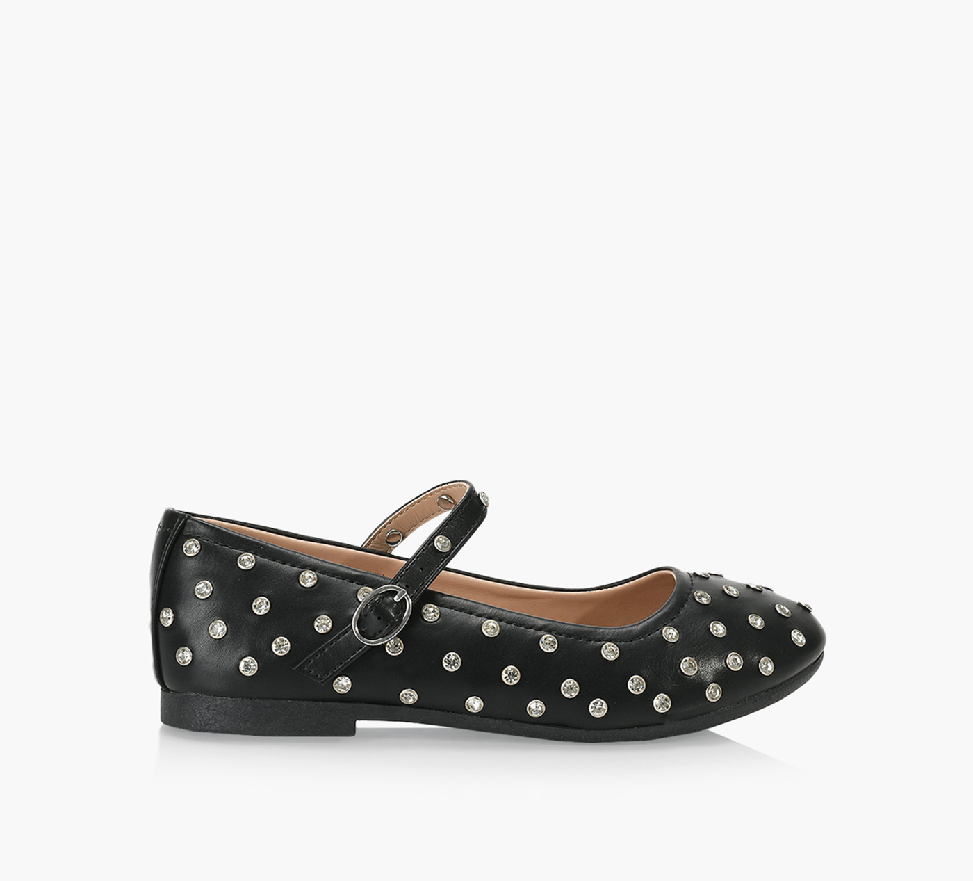 La Junior Venettar est une Mary Jane décontractée dotée d'une semelle plate et d'une délicate bride avec boucle sur le dessus. La tige et la bride sont décorées de clous en strass qui ajoutent de la texture et de l'éclat à ce modèle.