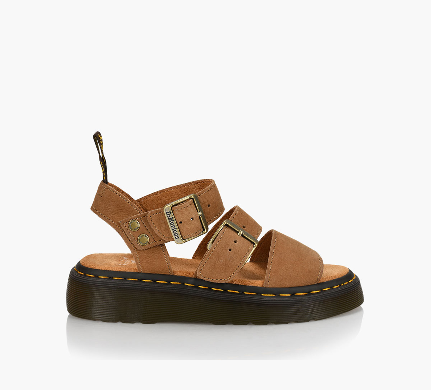 Les sandales à double boucle emblématiques de DM sont désormais pourvues d’une semelle super épaisse. Elles sont dotées de la tirette emblématique AirWair et d’une assise plantaire moelleuse.