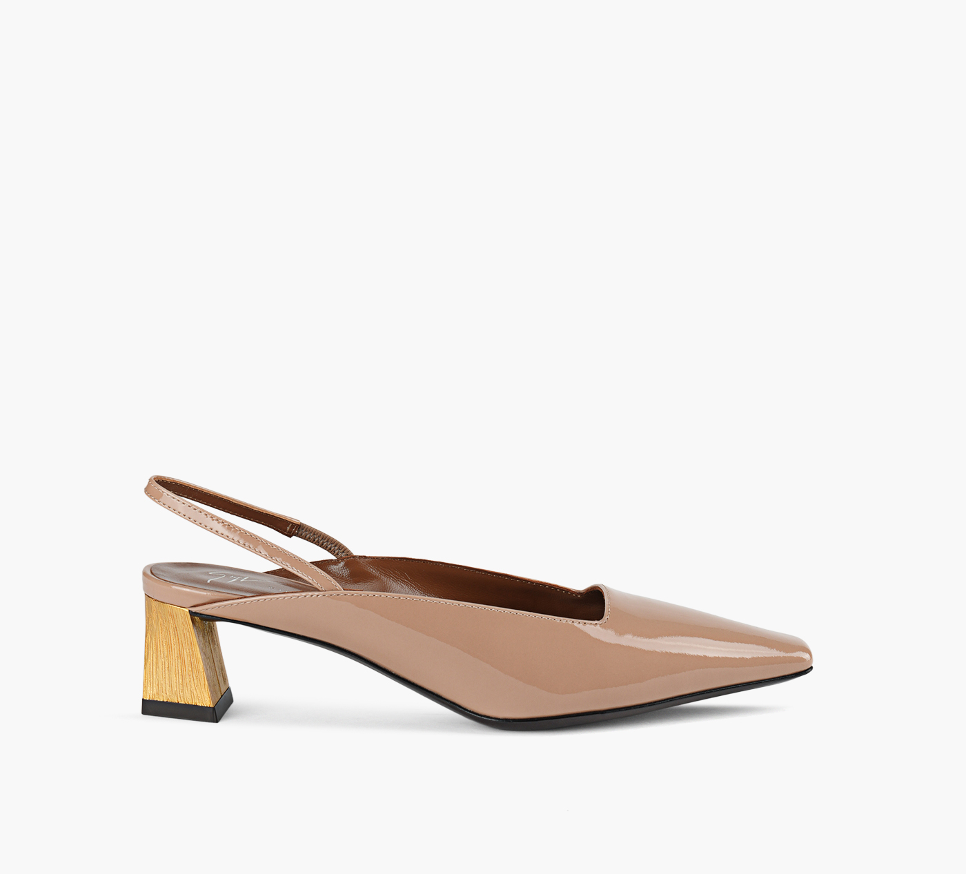 Giuseppe Zanotti a toujours cultivé un goût pour les ornements extravagants, mais avec les escarpins Brendha Sabot, le créateur démontre aussi son talent pour une construction soigneusement pensée. Déclinée dans une silhouette slingback intemporelle, cette paire à talon bloc est confectionnée en cuir brillant. Elle se termine par un bout carré allongé et élégant, surmonté d’un délicat bandeau doré signature apposé au talon.